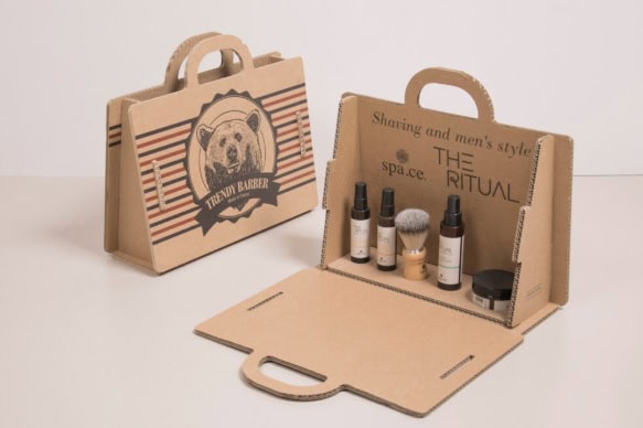 Caja cartón expositor regalo para productos de afeitado en cartón, con asas fácil de personalizar con logos e imágenes, resistente y elegante