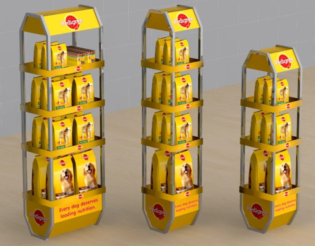 Exhibidor metálico de comida para perros, muy resistente, facil de instalar en las tiendas y con varias alturas para exponer diferentes gamas de productos.
