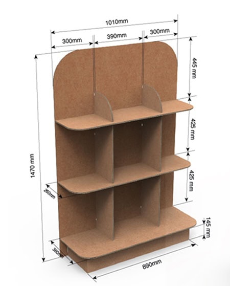 expositor o estructura de carton personalizado con 3 alturas y 2 separadores centrales, resistente y adaptable sin coste de troquel
