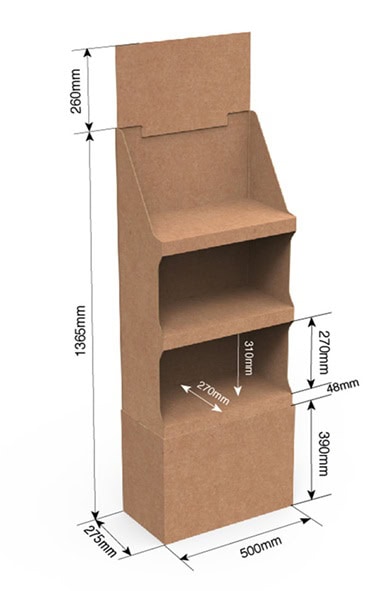 Expositores o estructuras de carton personalizadas con 3 estantes muy resistentes adaptables en medidas sin coste de troquel